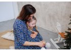 Dívčí swingové šaty z bio bavlněného úpletu s drobnými květy hořčicové a fialové barvy na tmavě modrém podkladu pro každou příležitost.