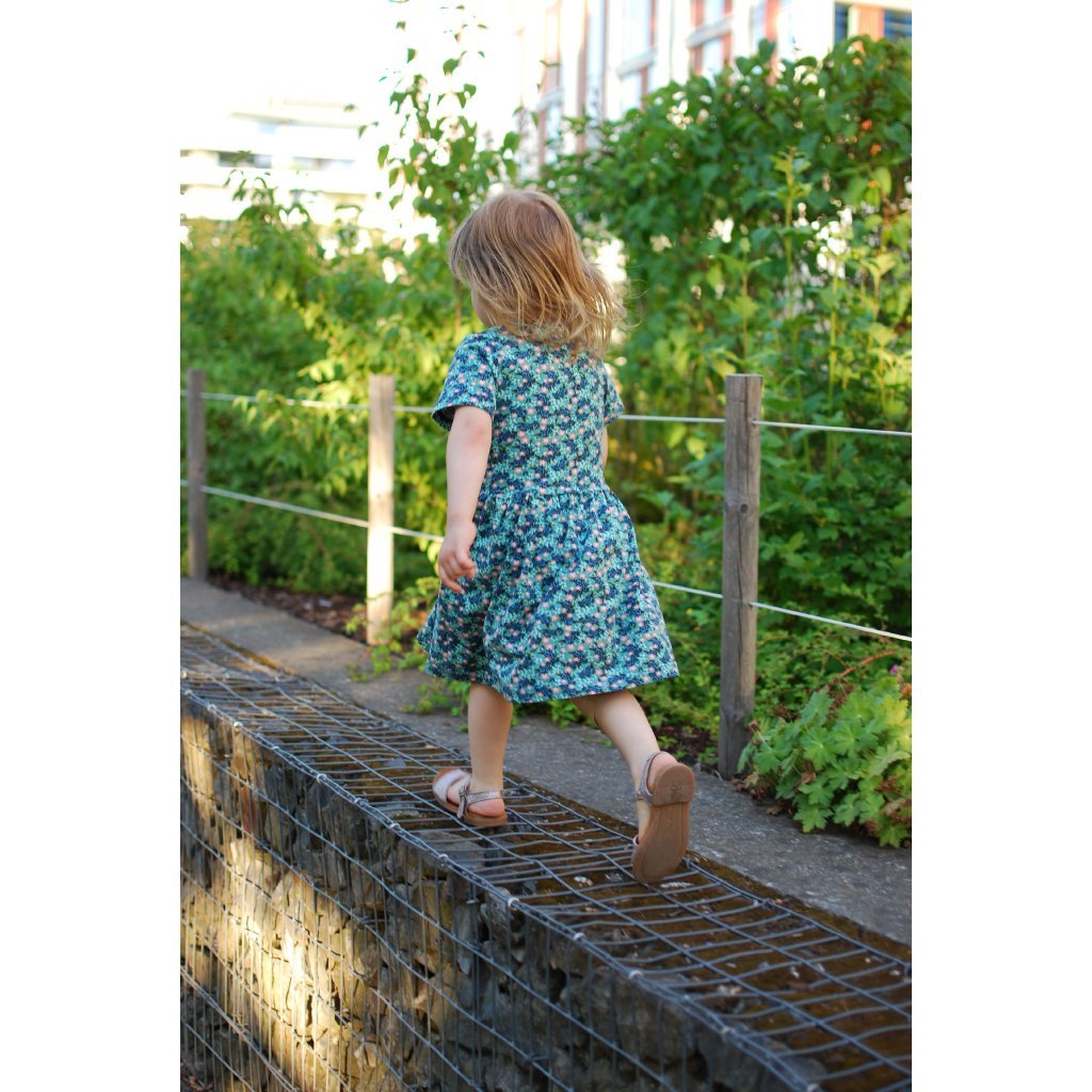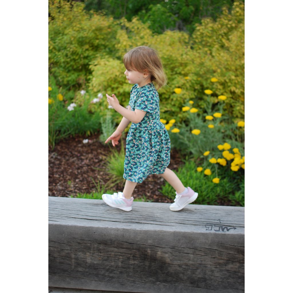 Šaty jsou příjemné, ležérní s drobnými růžovými květy na zeleném podkladu.